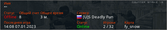 Играет на Counter Strike 1.6 сервере. Страна: РоссияПервый раз замечен 14:08 07.01.2023