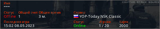 Играет на Counter Strike Source сервере. Страна: РоссияПервый раз замечен 15:02 08.05.2023