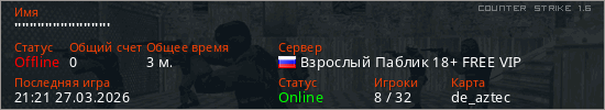 Играет на Counter Strike 1.6 сервере. Страна: РоссияПервый раз замечен 21:21 27.03.2026