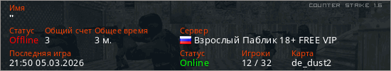 Играет на Counter Strike 1.6 сервере. Страна: РоссияПервый раз замечен 21:50 05.03.2026