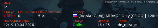 Играет на Counter Strike Global Offensive сервере. Страна: РоссияПервый раз замечен 12:14 10.04.2026
