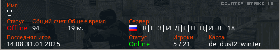 Играет на Counter Strike 1.6 сервере. Страна: РоссияПервый раз замечен 13:49 31.01.2025
