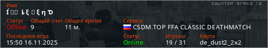 Играет на Counter Strike 1.6 сервере. Страна: РоссияПервый раз замечен 22:26 30.07.2025