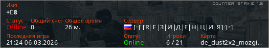 Играет на Counter Strike 1.6 сервере. Страна: РоссияПервый раз замечен 22:21 28.02.2026