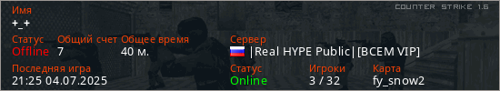 Играет на Counter Strike 1.6 сервере. Страна: РоссияПервый раз замечен 17:58 09.04.2024
