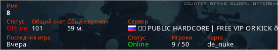 Играет на Counter Strike Global Offensive сервере. Страна: РоссияПервый раз замечен 17:53 22.04.2025