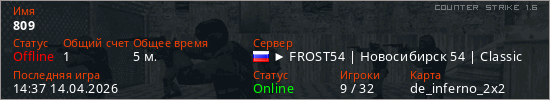 Играет на Counter Strike 1.6 сервере. Страна: РоссияПервый раз замечен 14:24 14.04.2026