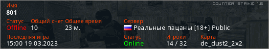 Играет на Counter Strike 1.6 сервере. Страна: РоссияПервый раз замечен 14:39 19.03.2023