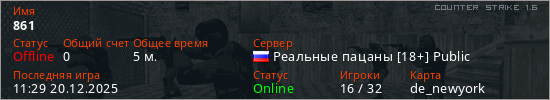 Играет на Counter Strike 1.6 сервере. Страна: РоссияПервый раз замечен 11:27 20.12.2025