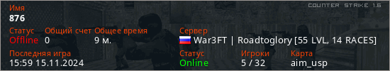 Играет на Counter Strike 1.6 сервере. Страна: РоссияПервый раз замечен 13:48 31.12.2023