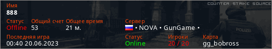 Играет на Counter Strike Source сервере. Страна: РоссияПервый раз замечен 18:11 04.11.2022