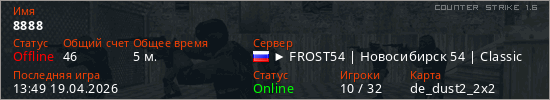 Играет на Counter Strike 1.6 сервере. Страна: РоссияПервый раз замечен 13:47 19.04.2026