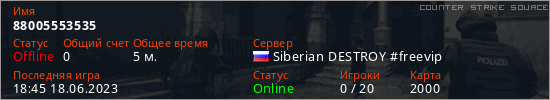 Играет на Counter Strike Source сервере. Страна: РоссияПервый раз замечен 18:37 18.06.2023