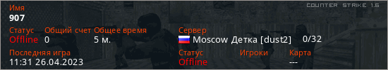 Играет на Counter Strike 1.6 сервере. Страна: РоссияПервый раз замечен 11:20 26.04.2023