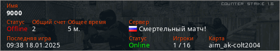 Играет на Counter Strike 1.6 сервере. Страна: РоссияПервый раз замечен 09:34 18.01.2025