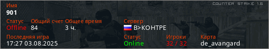 Играет на Counter Strike 1.6 сервере. Страна: РоссияПервый раз замечен 11:04 20.04.2022