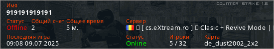 Играет на Counter Strike 1.6 сервере. Страна: РумынияПервый раз замечен 08:49 09.07.2025