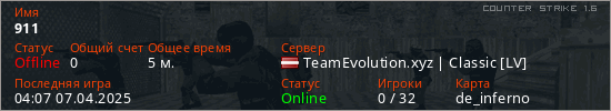 Играет на Counter Strike 1.6 сервере. Страна: ЛатвияПервый раз замечен 03:59 07.04.2025