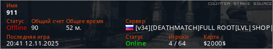 Играет на Counter Strike Source сервере. Страна: РоссияПервый раз замечен 10:20 25.02.2023