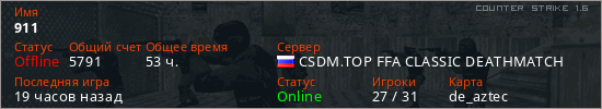 Играет на Counter Strike 1.6 сервере. Страна: РоссияПервый раз замечен 07:13 23.11.2019