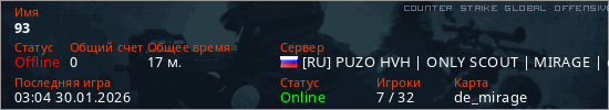 Играет на Counter Strike Global Offensive сервере. Страна: РоссияПервый раз замечен 01:55 30.01.2026