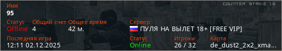 Играет на Counter Strike 1.6 сервере. Страна: РоссияПервый раз замечен 22:59 20.11.2025