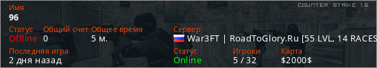 Играет на Counter Strike 1.6 сервере. Страна: РоссияПервый раз замечен 21:20 08.03.2026