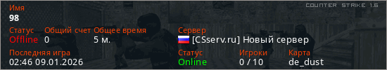 Играет на Counter Strike 1.6 сервере. Страна: РоссияПервый раз замечен 02:37 09.01.2026