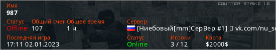 Играет на Counter Strike 1.6 сервере. Страна: РоссияПервый раз замечен 15:24 02.01.2023