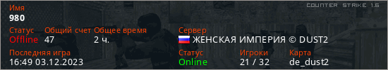 Последний раз был в сети 16:49 03.12.2023 Игрок с таким ником замечен на 7 серверах