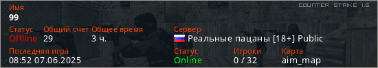 Играет на Counter Strike 1.6 сервере. Страна: РоссияПервый раз замечен 17:29 15.02.2023