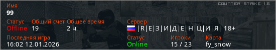 Последний раз был в сети 16:02 12.01.2026 Игрок с таким ником замечен на 47 серверах