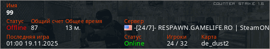 Играет на Counter Strike 1.6 сервере. Страна: СШАПервый раз замечен 03:01 05.02.2025