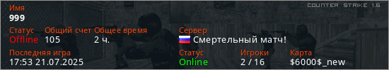 Последний раз был в сети 17:53 21.07.2025 Игрок с таким ником замечен на 63 серверах