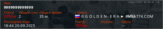 Играет на Counter Strike 1.6 сервере. Страна: РоссияПервый раз замечен 17:45 20.09.2025