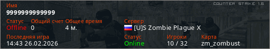 Играет на Counter Strike 1.6 сервере. Страна: РоссияПервый раз замечен 14:41 26.02.2026