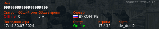Играет на Counter Strike 1.6 сервере. Страна: РоссияПервый раз замечен 17:12 30.07.2024