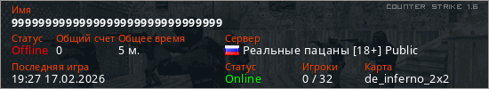 Играет на Counter Strike 1.6 сервере. Страна: РоссияПервый раз замечен 19:25 17.02.2026