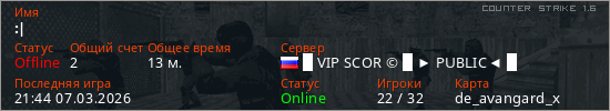 Играет на Counter Strike 1.6 сервере. Страна: РоссияПервый раз замечен 19:35 07.03.2026