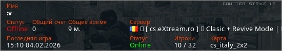 Играет на Counter Strike 1.6 сервере. Страна: РумынияПервый раз замечен 18:28 02.02.2026