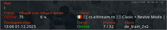 Играет на Counter Strike 1.6 сервере. Страна: РумынияПервый раз замечен 22:33 27.10.2024