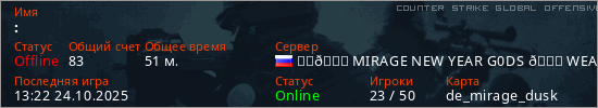 Играет на Counter Strike Global Offensive сервере. Страна: РоссияПервый раз замечен 13:35 14.03.2025