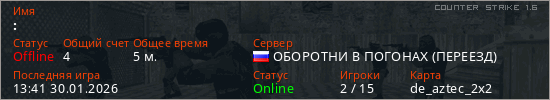 Играет на Counter Strike 1.6 сервере. Страна: РоссияПервый раз замечен 13:39 30.01.2026