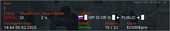 Играет на Counter Strike 1.6 сервере. Страна: РоссияПервый раз замечен 18:04 02.02.2026