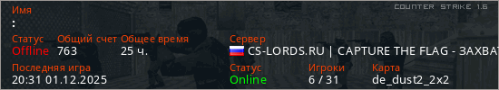 Играет на Counter Strike 1.6 сервере. Страна: РоссияПервый раз замечен 18:02 14.10.2020