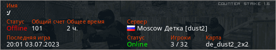 Играет на Counter Strike 1.6 сервере. Страна: РоссияПервый раз замечен 18:58 30.07.2020
