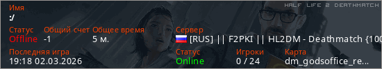 Играет на Half Life 2 DeathMatch сервере. Страна: РоссияПервый раз замечен 19:14 02.03.2026