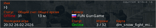 Играет на Counter Strike 1.6 сервере. Страна: РоссияПервый раз замечен 19:29 26.02.2026