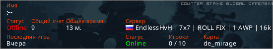 Играет на Counter Strike Global Offensive сервере. Страна: РоссияПервый раз замечен 20:12 02.03.2026