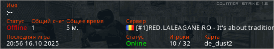 Играет на Counter Strike 1.6 сервере. Страна: РумынияПервый раз замечен 20:54 16.10.2025
